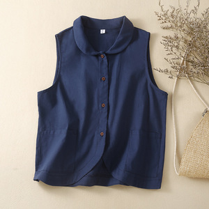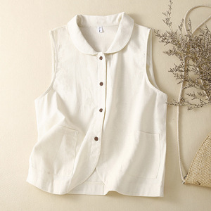 実写2023春秋新作ベスト文芸レトロ綿麻子供襟コートカジュアル女性ベスト