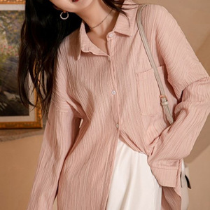 仙気肌理ストライプ長袖シャツ レディース ゆったりミドル丈 2024春夏 プリーツ無地ポケット付き 優しいシャツ