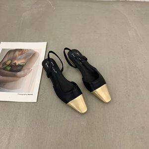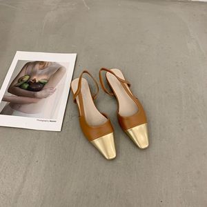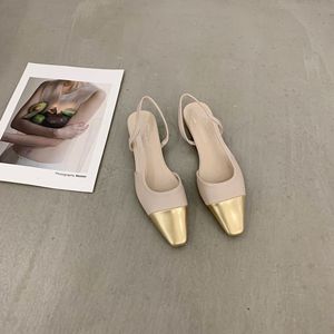 フランス風ローヒール小香風包頭サンダル レディースシューズ 2025年春夏新作 ゴールドスクエアトゥ イブニングシューズ