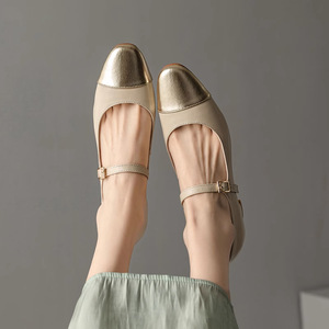 Xinyuda~本革フレンチ文学気質レディカラーブロック中太ヒールラウンドトゥ浅口メリージェーンシューズ女性用