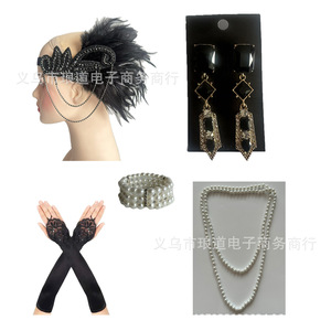 1920仮装舞踏会アクセサリーギャツビーパーティーフェザー合金ヘッドバンド真珠ネックレス长烟ロッド手袋セット
