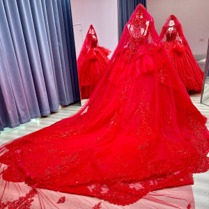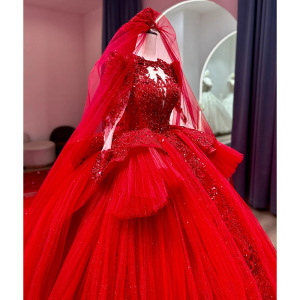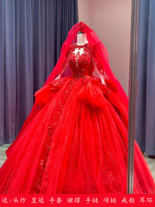 赤色の中国風メインウェディングドレス2025新作花嫁高級感レトロ宮廷風重厚豪華長袖ロングトレーン