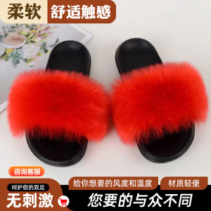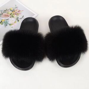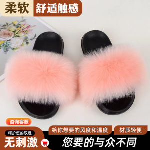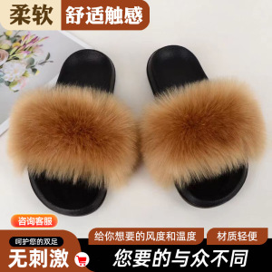 平平一字の涼しい女性は毛のスリッパを着ています。