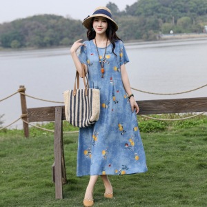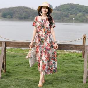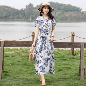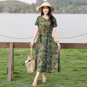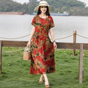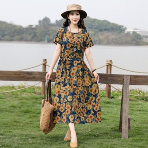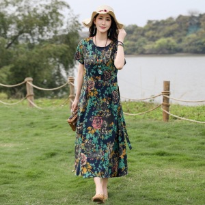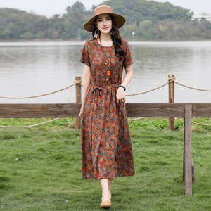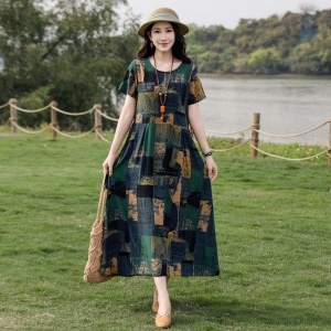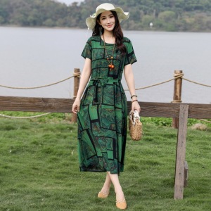 中高年ママ向けの新しい夏の純綿シルクドレス、大きいサイズ、ゆったり、スリム、膝上、お腹カバー、ミドル丈スタイル