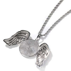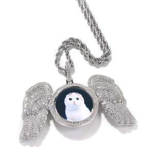 欧米で人気のクロスボーダーDIY写真フレームペンダント、ヒップホップ風ダイヤモンド付き丸型羽根ネックレス