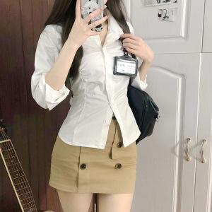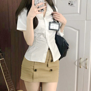 V型白の短いシャツ + カーキ色のエンボススカート + 上帆学院はネクタイをしないでください。