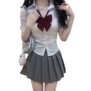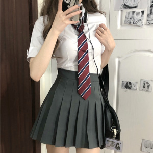 V型白の短いシャツ + 濃い灰色のエンボススカート + 上帆学院はネクタイをしないでください。
