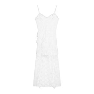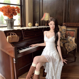 Amazon フレンチレース V ネックサスペンダードレス旅行夏休み不規則なスカートウエストミドル丈スカート