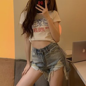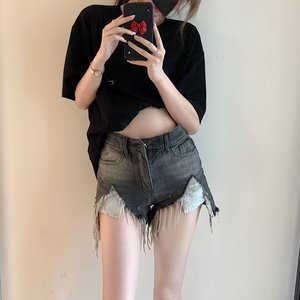 黒灰色の高腰の穴が開いているデニムの半ズボンの女性の夏の新型はゆったりしていて痩せています。