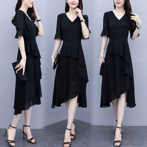 実写の大きいサイズのシフォンの中で長いタイプのワンピースの女性の夏の新型の気質の女神の範赫本風の黒色の小さい黒いスカート