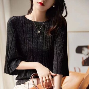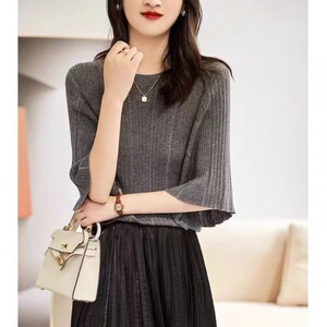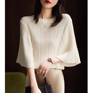 フランスの文芸範 _ のデザイン感の縦条の筋理の美しいハスの葉の袖のニットのプルオーバー