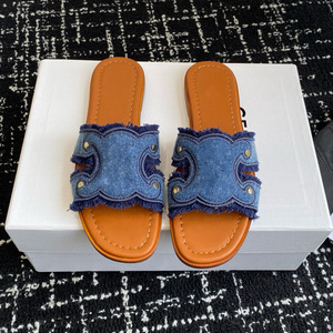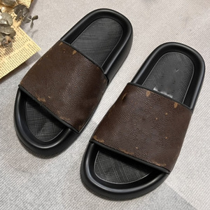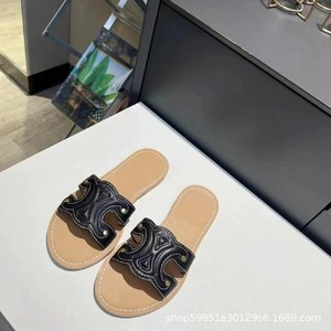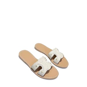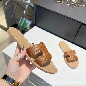 高バージョンの夏の新型の茶色のエンボスのフラットスリッパの女性の本革のファッションの外は丸い頭の1字の牛革を着て涼しいです。