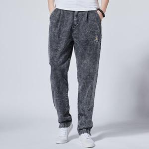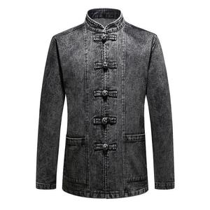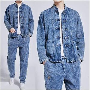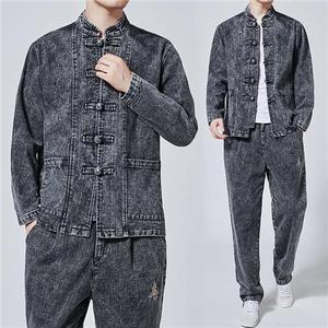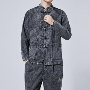 中国風メンズデニムジャケット男性セットレトロ盤ボタン刺繍唐装青年立襟ゆるい潮牌コート