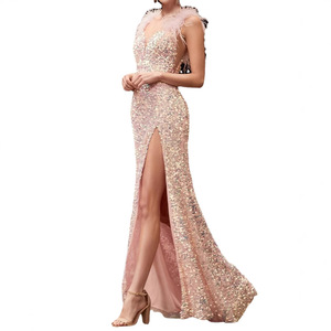 2025年 クロスボーダー新作 スパンコール エレガント 通勤 無地 ミドルウエスト レッド フェザー ホスト 宴会 ロングドレス イブニングドレス