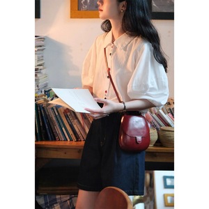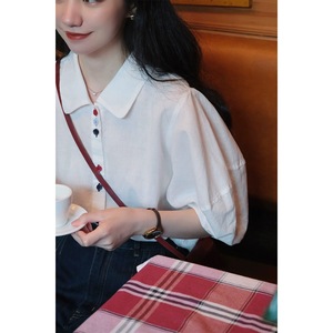 日系文芸亜麻生地カラーボタン灯籠袖白色半袖軽薄通気シャツ