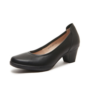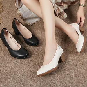 プラチナ2025春新作ハイヒール太ヒール通勤レディースシューズ浅口乳白色ソフト牛革快適レディースシューズ