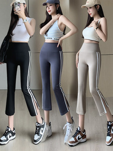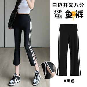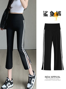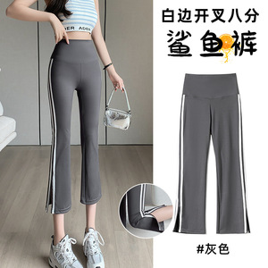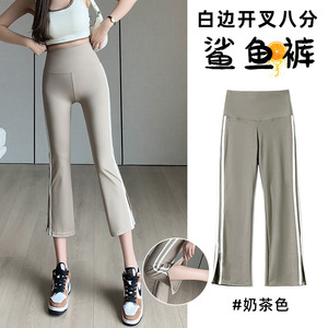白い辺のサメのラッパのズボンの女性の外は夏の薄い金の小さい背の八分の腰を着てフォークを開けます。