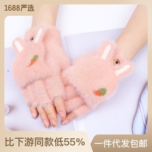 冬用手袋 学生 子供用 ハーフフィンガー フリップカバー 漫画風ニンジン柄 ふわふわ 厚手 保温 卸売 可愛い動物