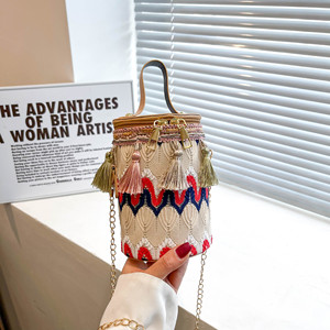 2025 トレンディなファッションエスニックスタイルシリンダーバッグニッチデザインショルダーメッセンジャーバッグレトロタッセルバケットバッグ