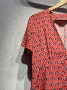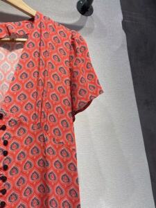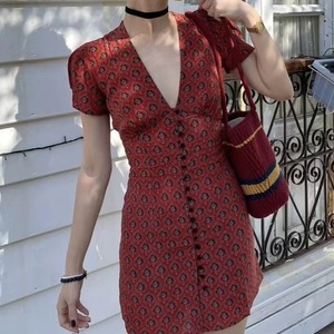 小柄な方向けの花柄ワンピース、高級感のあるフレンチスタイル、深いVネック、プリント柄、ボタン留め、ウエストシェイプ、ヒップを包み込む花柄ワンピース