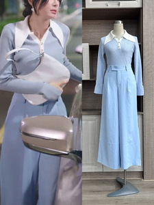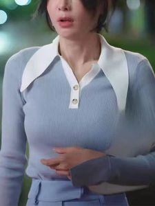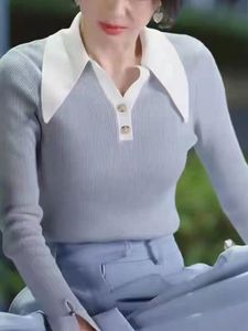 秦蘭と同じスタイルのブルーコントラストPOLO襟長袖ニットトップスと万能ワイドレッグパンツのおしゃれなセット