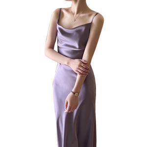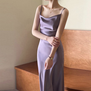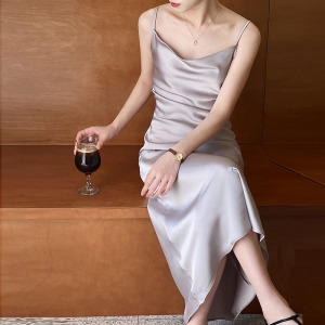 アセテートスイングカラーサスペンダードレスフェミニンシルクスリムサテンシルクスカートハイエンド女神ロングスカート