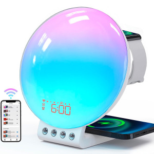 三合一15w無線充のまぶしい色の覚醒灯は日の出の日没の目覚まし時計の雰囲気の明かりの白い騒音の子供の明かりを模擬します。