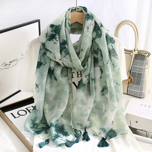 韓国版ファッション百合秋冬保温薄手スプレープリント綿麻手触りバリ糸流蘇長型マフラー女