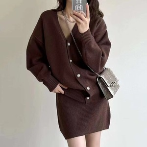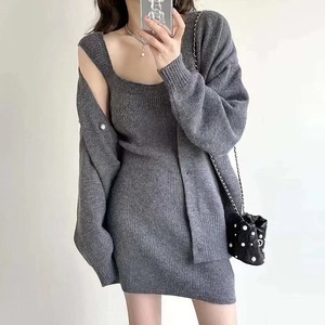 韓国chic秋冬レトロカーディガン長袖ニットセーターコート + 方襟スリムスリムストラップワンピース