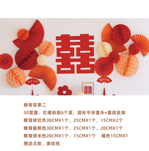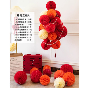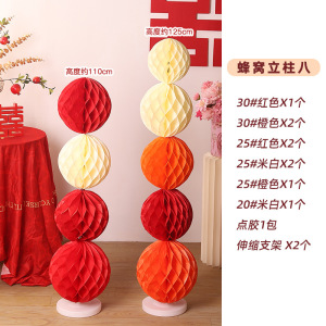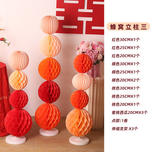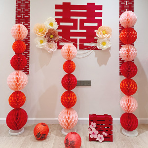 結婚ハニカムボールの柱が男女の結婚式の部屋の寝室の提灯を飾っています。