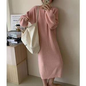 秋冬の服の新型の怠惰な風のニットの長袖のワンピースの女性のゆったりした中の長いタイプは膝の純色のセーターを過ぎてスカートを打ちます。
