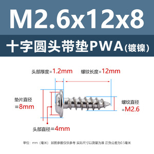 PWA2.6 * 12*8 (鉄ニッケル円頭パッド付きタッピングネジ)(200個)