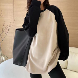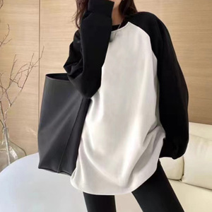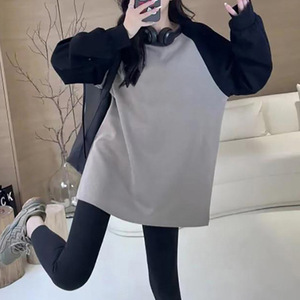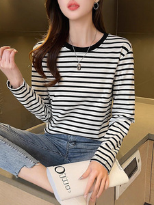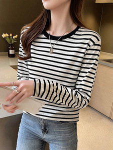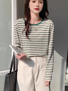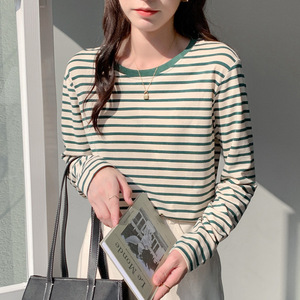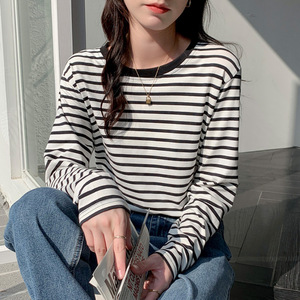 ストライプの底のシャツの女性の中に春と秋の洋風の丸首を掛けてゆったりとしていて、やせています。長袖のtシャツにカジュアルに上着を着ます。