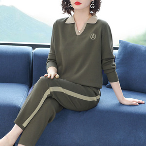 ファッションの襟をめくって、お母さんはレジャーのスポーツのスーツの女性の春秋服の新型のニットの2セットの濮院のセーターを詰めます。