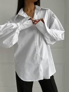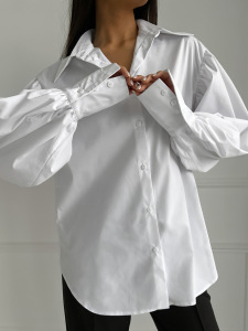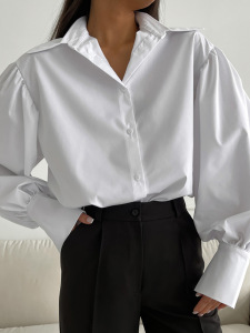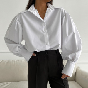 フレンチスタイルのシンプルな白い襟の泡袖シャツ秋のカジュアルなゆるい長袖シャツの女装