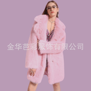 2025 新しいクロスボーダー模造キツネの毛皮の女性のコート V ネックピンクミッドレングスファッションルーズ暖かい模造毛皮
