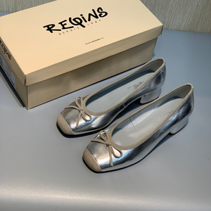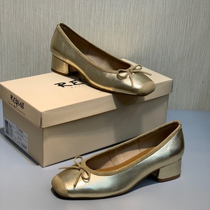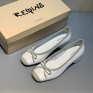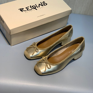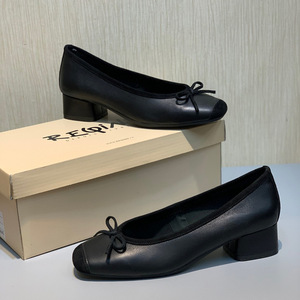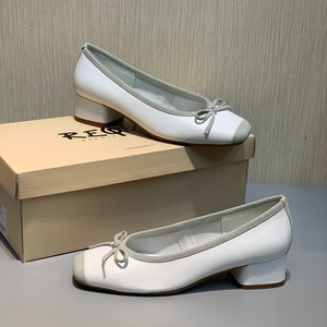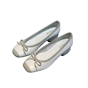 超柔らかい羊皮バレエ靴の女性の浅い口の中で靴の丸い頭の本革の蝶結びの太いハイヒール