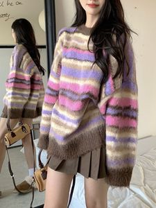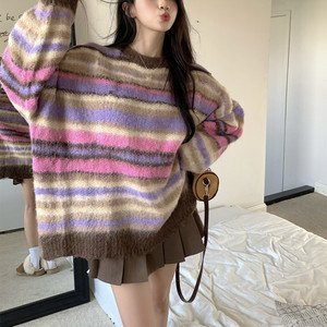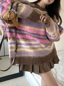 ストライプセーター、秋冬のカラフルなルーズプルオーバー、ソフトでワックスのようなボトムトップス、レイジースタイルニットセーター、女性用多用途セーター