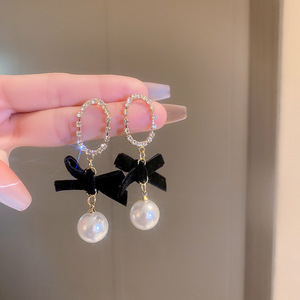 2 # 銀針-白いダイヤモンド蝶ネクタイ真珠イヤリング