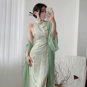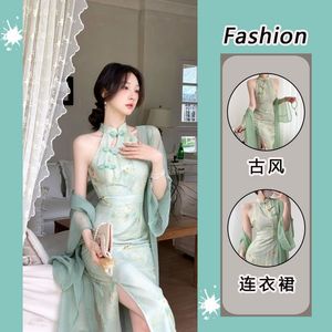2023新式の袖なしの首の緑色のチャイナドレスの改良版のワンピースの若いタイプの高級な気質の少女の小さい子供