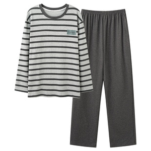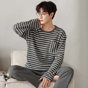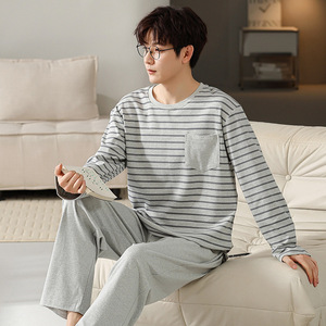 男性パジャマ秋の新型ニット綿長袖カバーカジュアルストライプの大きいサイズは家庭服セットを着ることができます。