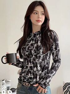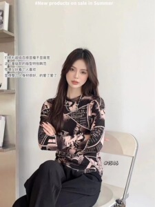 模範夫人の国風の底のシャツの女性の秋冬の復古風の半高襟のプリントの長袖の怠惰なカジュアルな底の上着