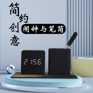 在庫あり シンプルな木製多機能ペン立て付き目覚まし時計 LED音声制御電子木製時計 モダンでシンプルな目覚まし時計