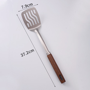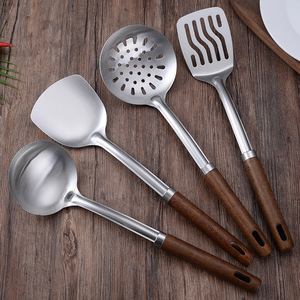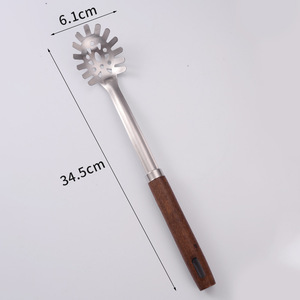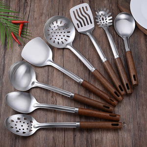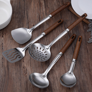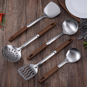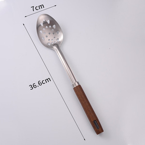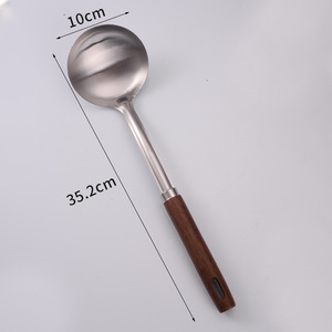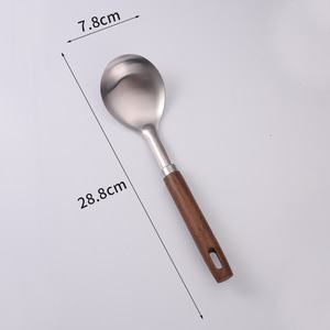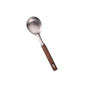 ステンレスの長い柄の鍋はスプーンをすくって家庭用の台所を厚くして断熱の丸い木の柄のスプーンを温めます。