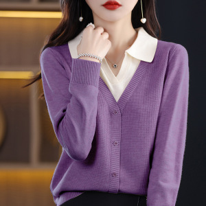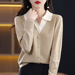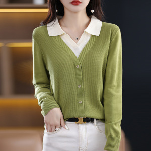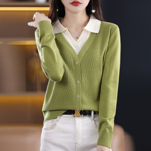 偽の2枚の襟の長袖の底のニットの女性の短い項のゆったりしたpoloの襟のセーターの上着の洋風の韓国版のセーター