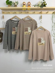 823434森の女性の色合わせの漫画のストライプのゆったりした長袖のtシャツの女性の早秋の新型の怠惰で快適な底の小さいシャツ