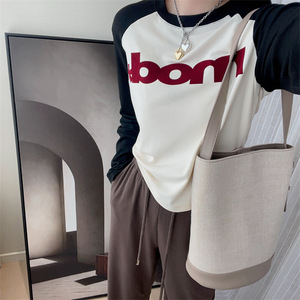 2023秋の肌の植毛の文字の短いモデルのモーダルのtシャツの女性の肩はやせている長袖の底のシャツを現します。
