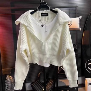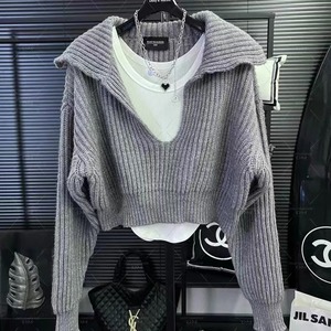 レトロな大衆デザイン感vネック海軍襟ショートセーター女性秋冬2024外着プルオーバー高腰ニット