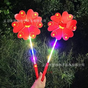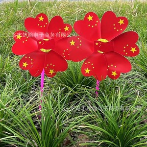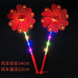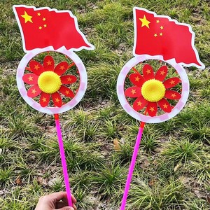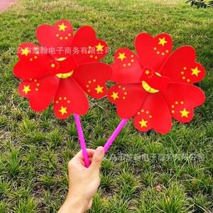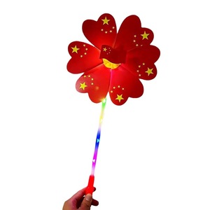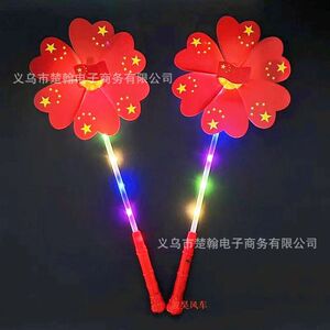 国慶節は赤い旗の風車を持って光り輝いています。