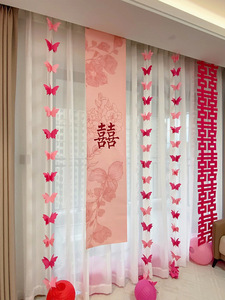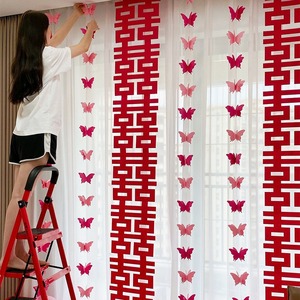 ウェディングルームのカーテンの長いリボンのペンダントのペンダントの装飾の結婚式の寝室の新しい部屋の配置の窓の蝶の花